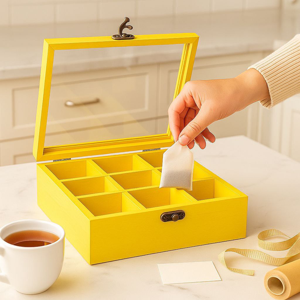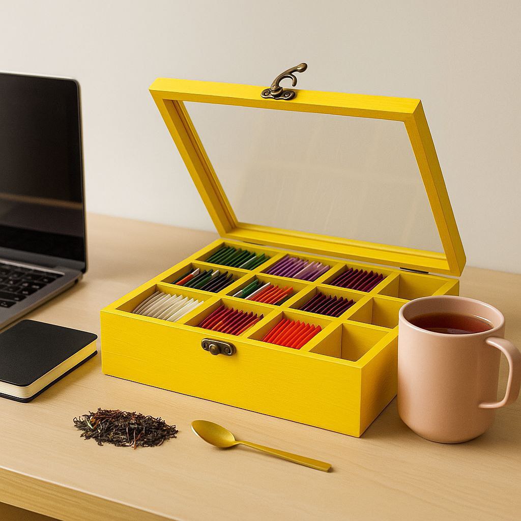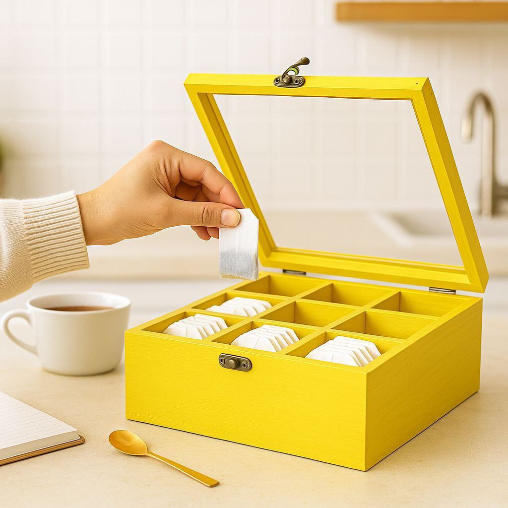 علبة شاي خشب سويدي بغطاء أكريليك شفاف، بتساعدك ترتب كل أنواع المشروبات الساخنة بشكل شيك وسهل الاستخدام.