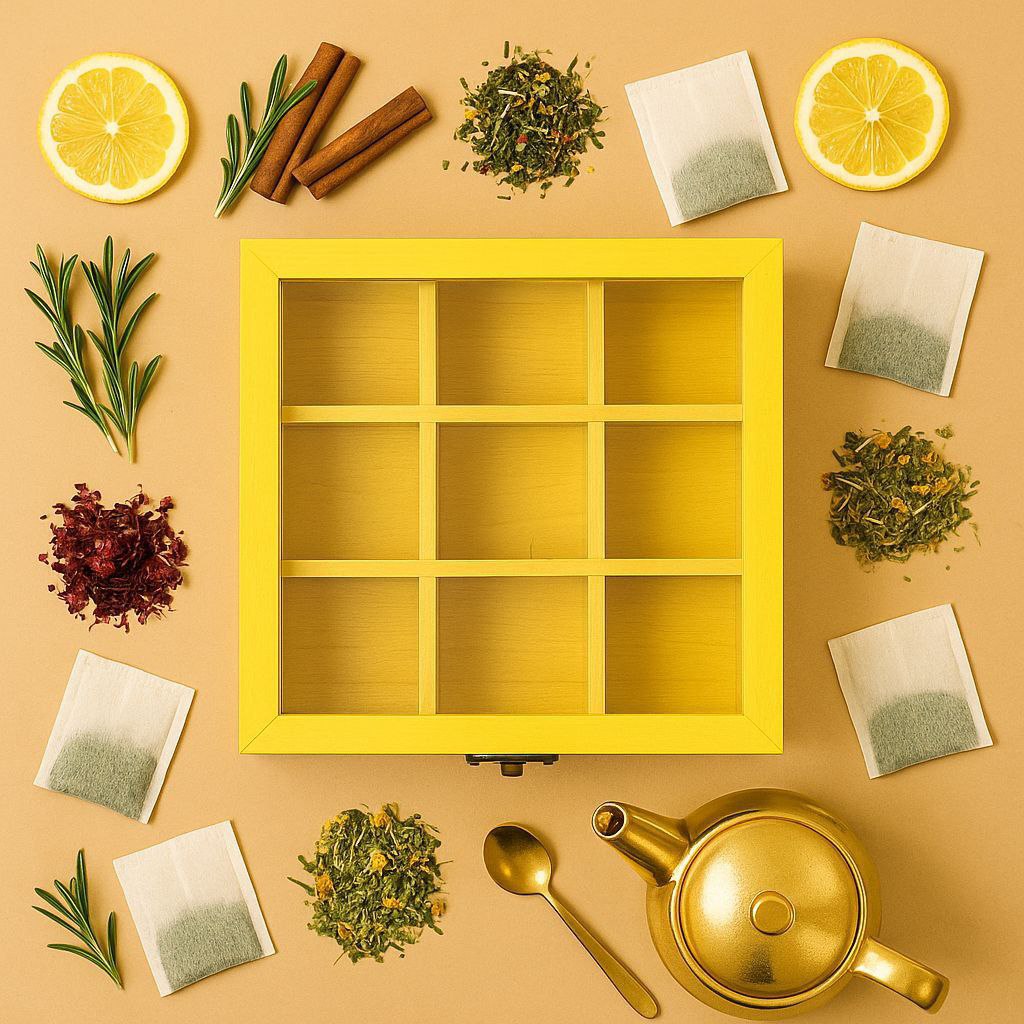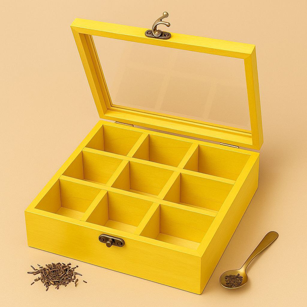 علبة شاي خشب فاخرة بغطاء أكريليك – 9 خانات لتنظيم الكوفي كورنر