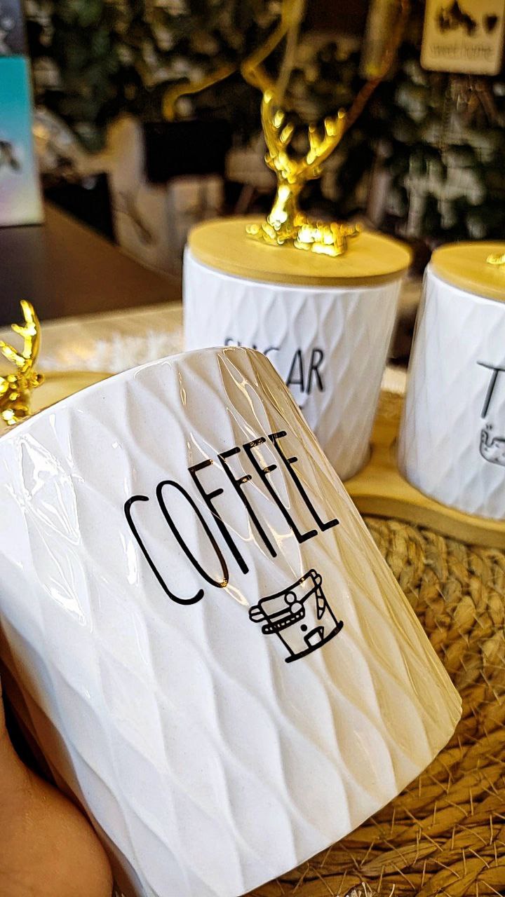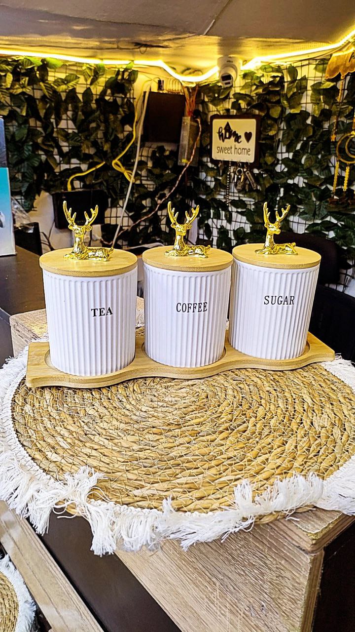 طقم برطمان كوفي أنيق مكون من 3 قطع بورسلين عالي الجودة بتصميم بابلز عصري، مزود بحامل خشب طبيعي لسهولة التنظيم والعرض.