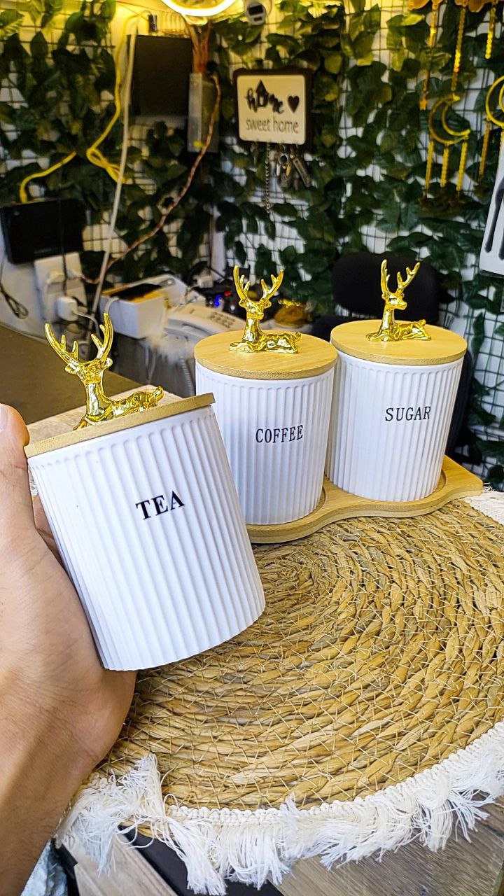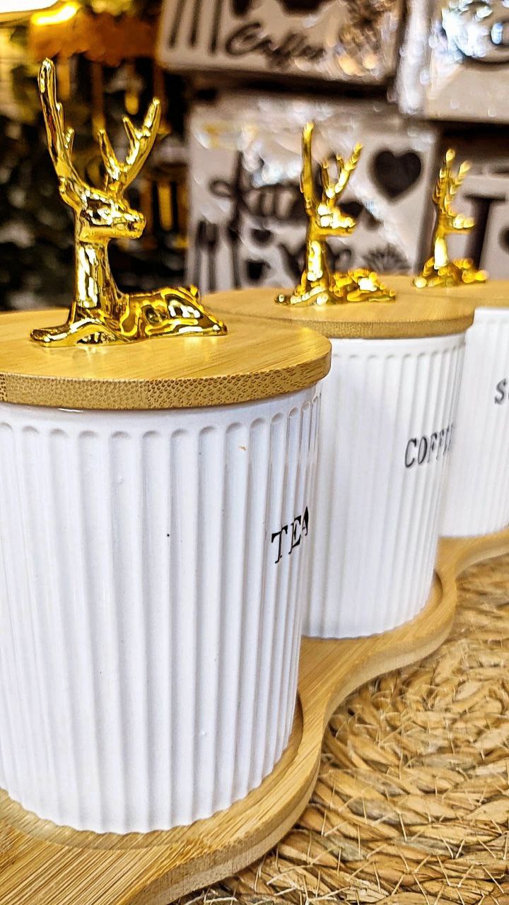 طقم برطمان كوفي بورسلين 3 قطع بحامل خشب – سعة 750 مل