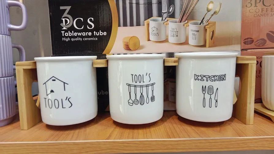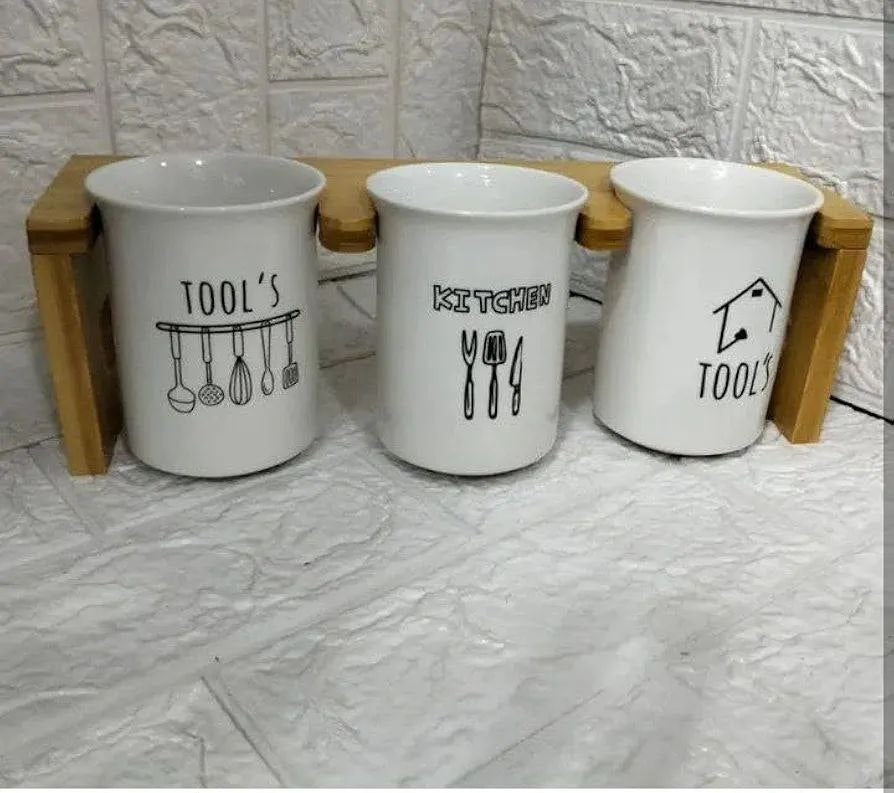 طقم صفاية معالق ثلاثية أنيق مكوّن من 3 قطع بورسلين راقية على استاند خشب طبيعي