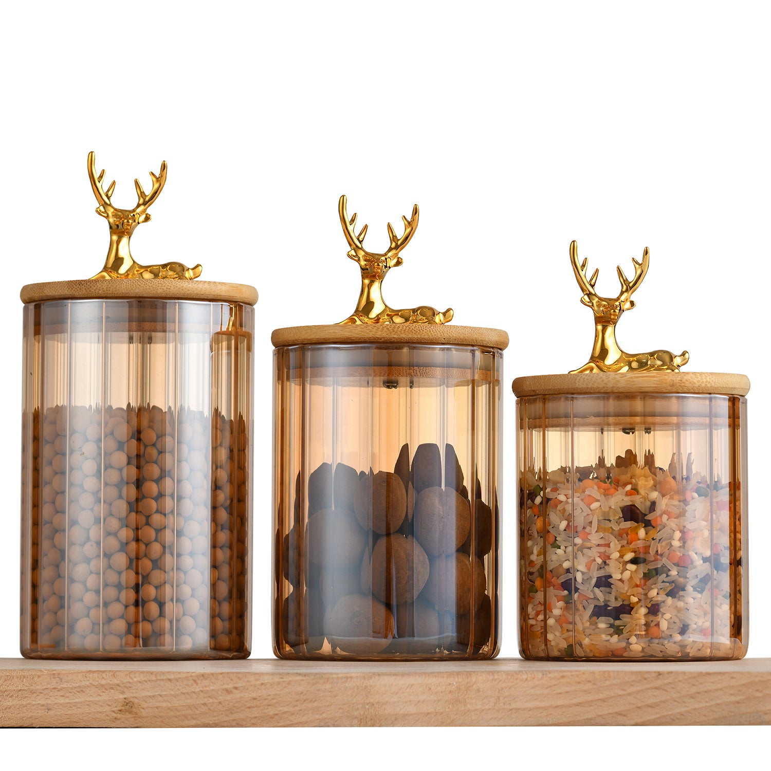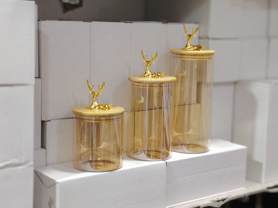أضيفي لمسة من الأناقة لمطبخك مع برطمان الغزالة الرايقة 🦌 المصنوع من زجاج بيركس بيور عالي الجودة يتحمل الحرارة والبرودة بسهولة.يأتي بغطاء خشب بامبو فاخر مزود بمجسّم غزالة جولد فخم يمنحه مظهر ديكوري راقٍ يناسب أي ركن في المنزل.مثالي لتخزين الحلويات، المكسرات أو القهوة والسكر — يجمع بين الجمال والعملية.متوفر بثلاثة مقاسات لتناسب جميع احتياجاتك 💛